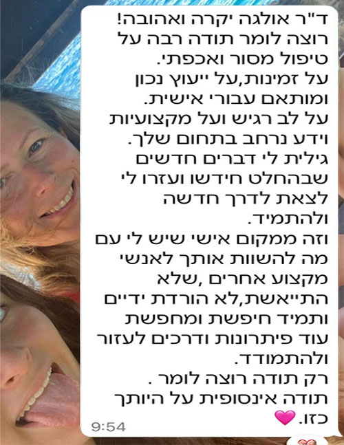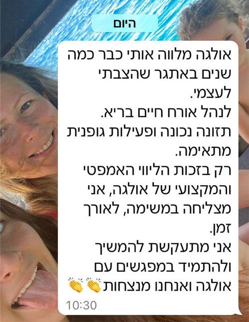 "אולגה המקסימה !!! אני מסוגלת שוב לעלות במדרגות לקומה רביעית בעבודה!! וקניתי לי מכנסיים 👖 במידה 40!!!! זה 2 מידות פחות, אין עלייך אלופת עולם ❤❤❤❤💕💕❤"